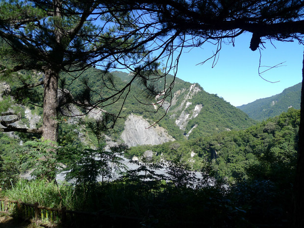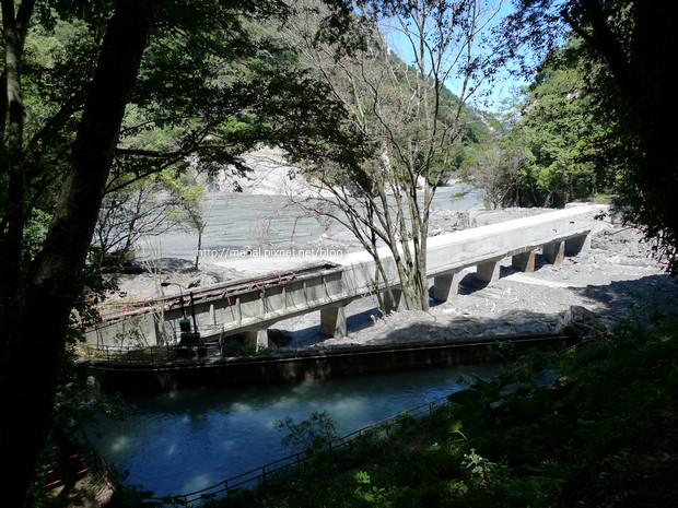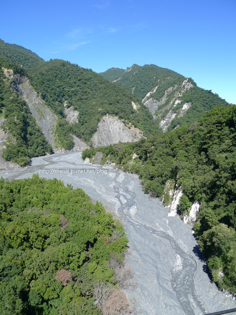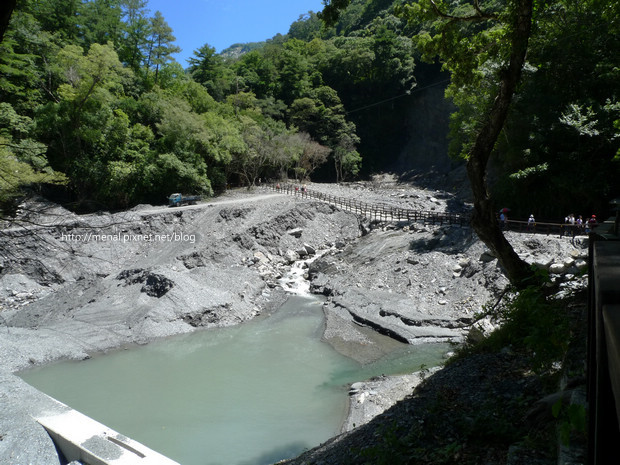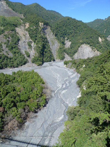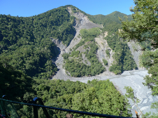 禿了一邊的邊坡,砂石統統沖進河谷,從吊橋往下看,更是觸目驚心